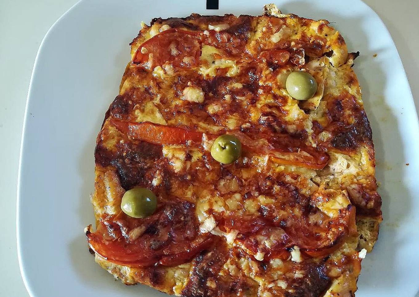 - Cubrimos la bandeja con la mezcla del pollo, añadimos rodajas de tomate y cubrimos con queso. Metemos al horno/grill unos 40 minutos