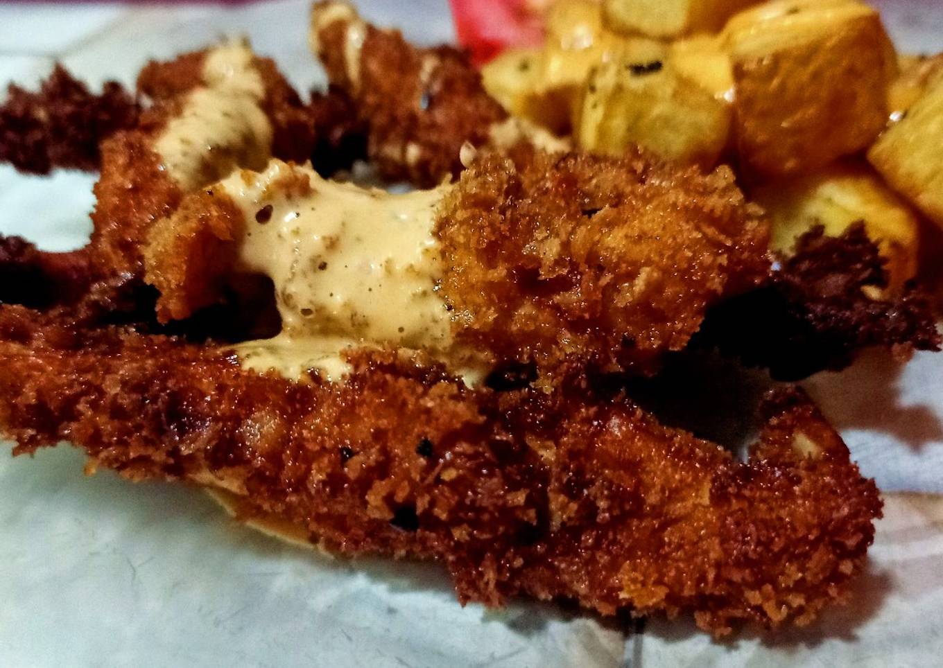 - Pasamos por huevo y napamos con el panko, rebozar en tandas pequeñas, servir con patatas