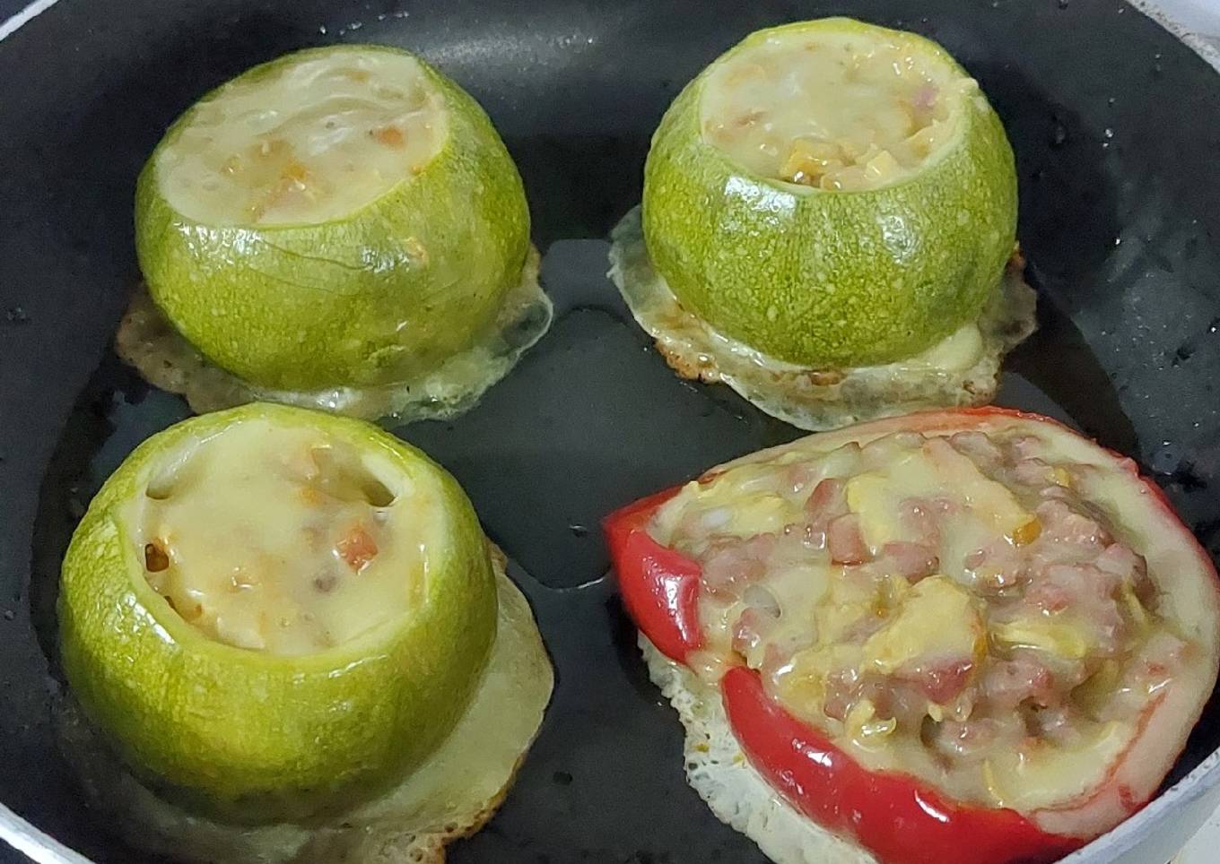 - SIN NECESIDAD DE USAR EL HORNO, Poner los calabacines y el pimiento en la sartén más alta con un poco de aove en el fondo y tapar durante 10 minutos a fuego lento para que no se quemen por debajo, pero sí se derrita el queso.