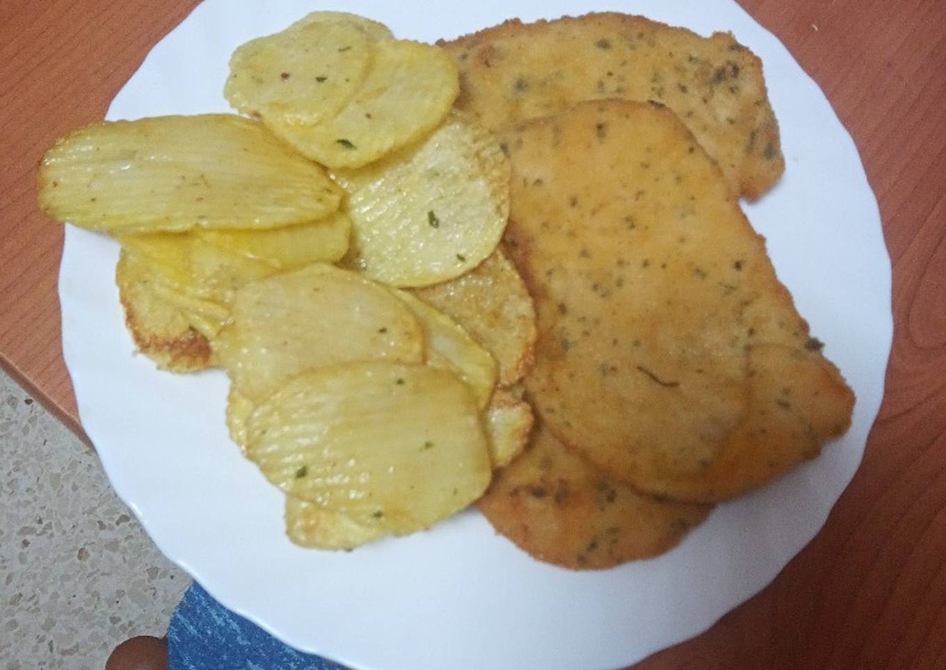 Milanesas de pollo al ajillo con papas fritas onduladas