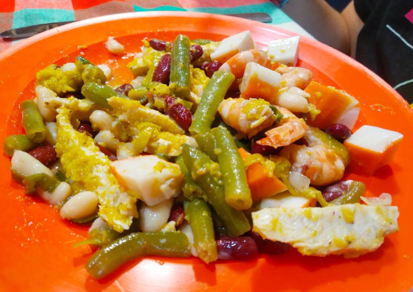 Ensalada de tres judías, pollo, langostinos y mojo de naranja