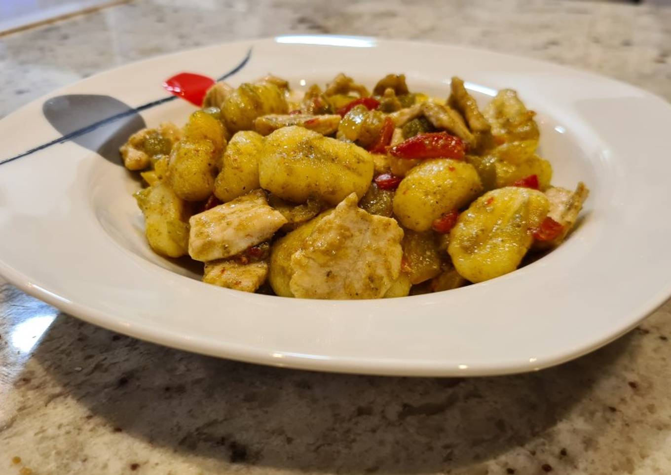 Ñoquis con pimientos tricolor, pollo y pesto de pipas