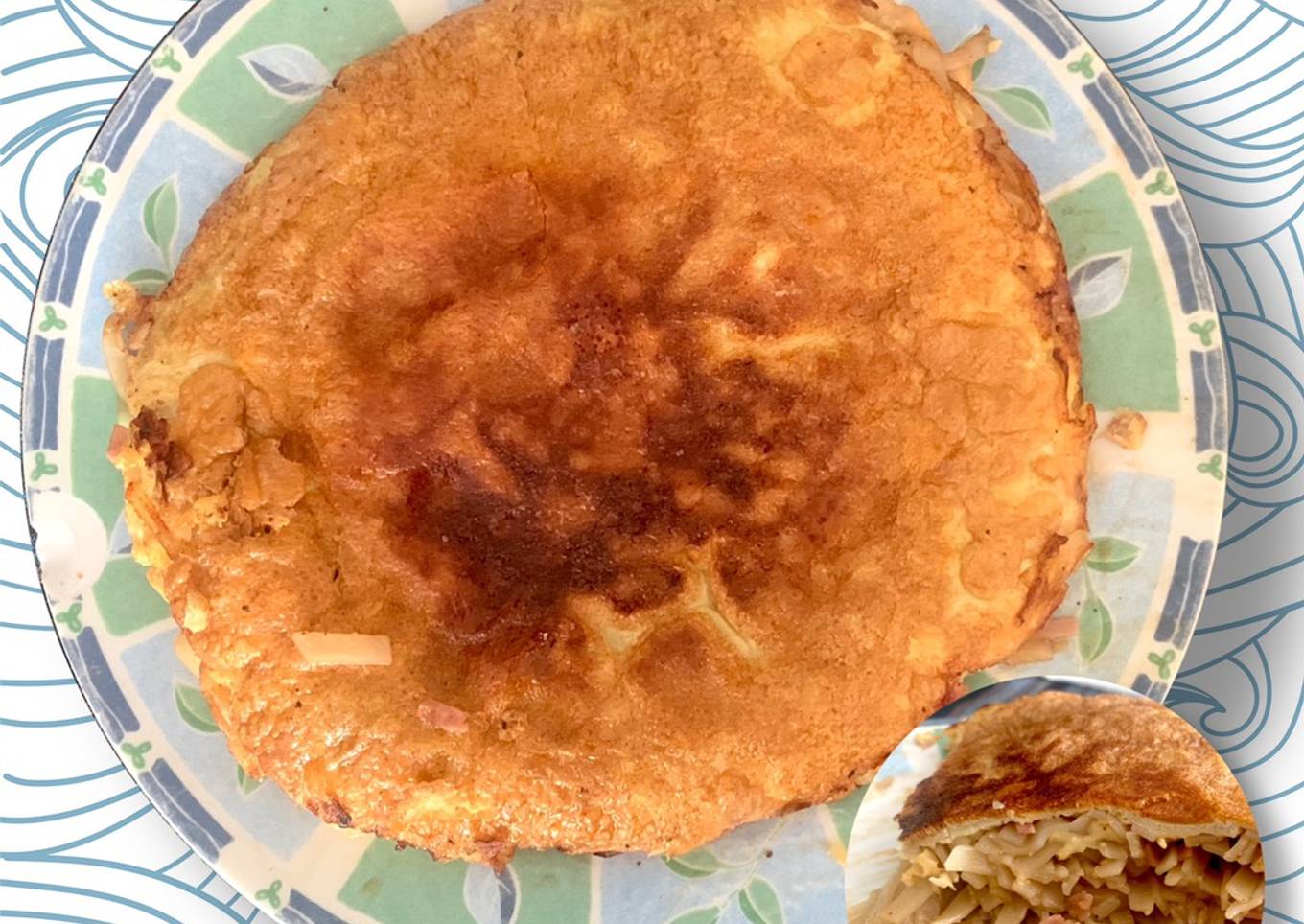 - Ponemos los tallarines con el pollo y el jamón sobre la base y lo cubrimos con el resto de los huevos batidos.