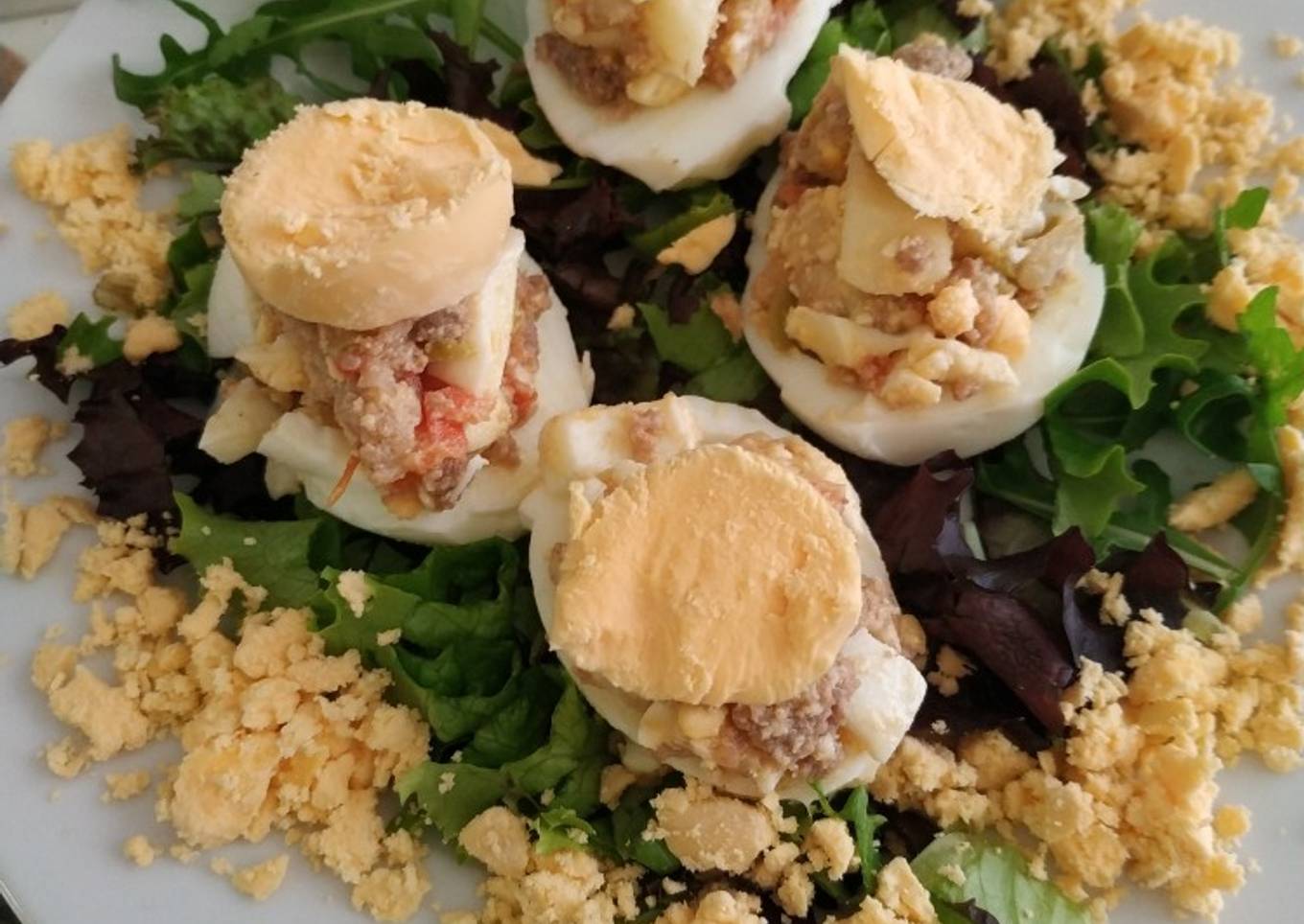 - Cortar algunas yemas en rodajas y adornar con ellas los huevos rellenos. Acompañar con hojas de lechugas aliñadas con aceite de oliva y sal. Al resto de yemas pisarlas con tenedor y esparcirlas a los lados de las hojas de lechugas.