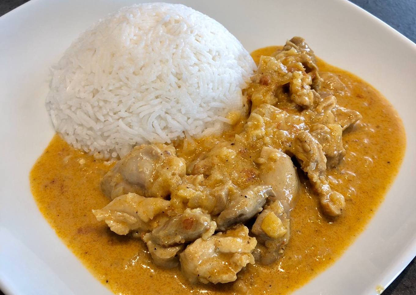 - Una vez que esté dorado el pollo, añadimos la leche de coco y cocinamos alrededor de 15 minutos a fuego lento/medio para que se vaya haciendo el pollo.