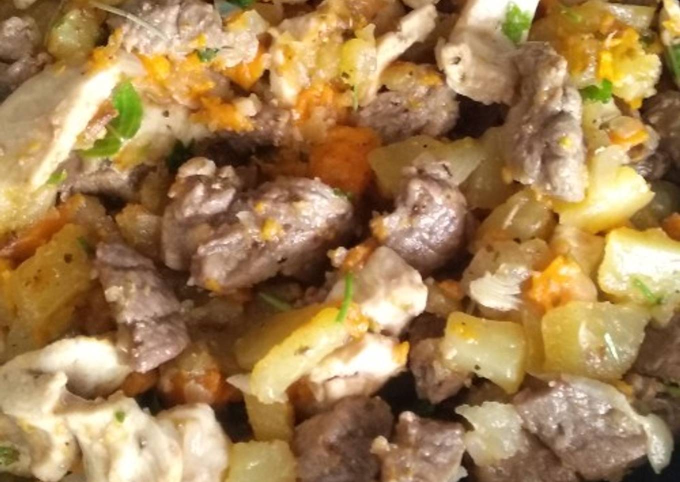 Ternera y pollo con patatas y boniato