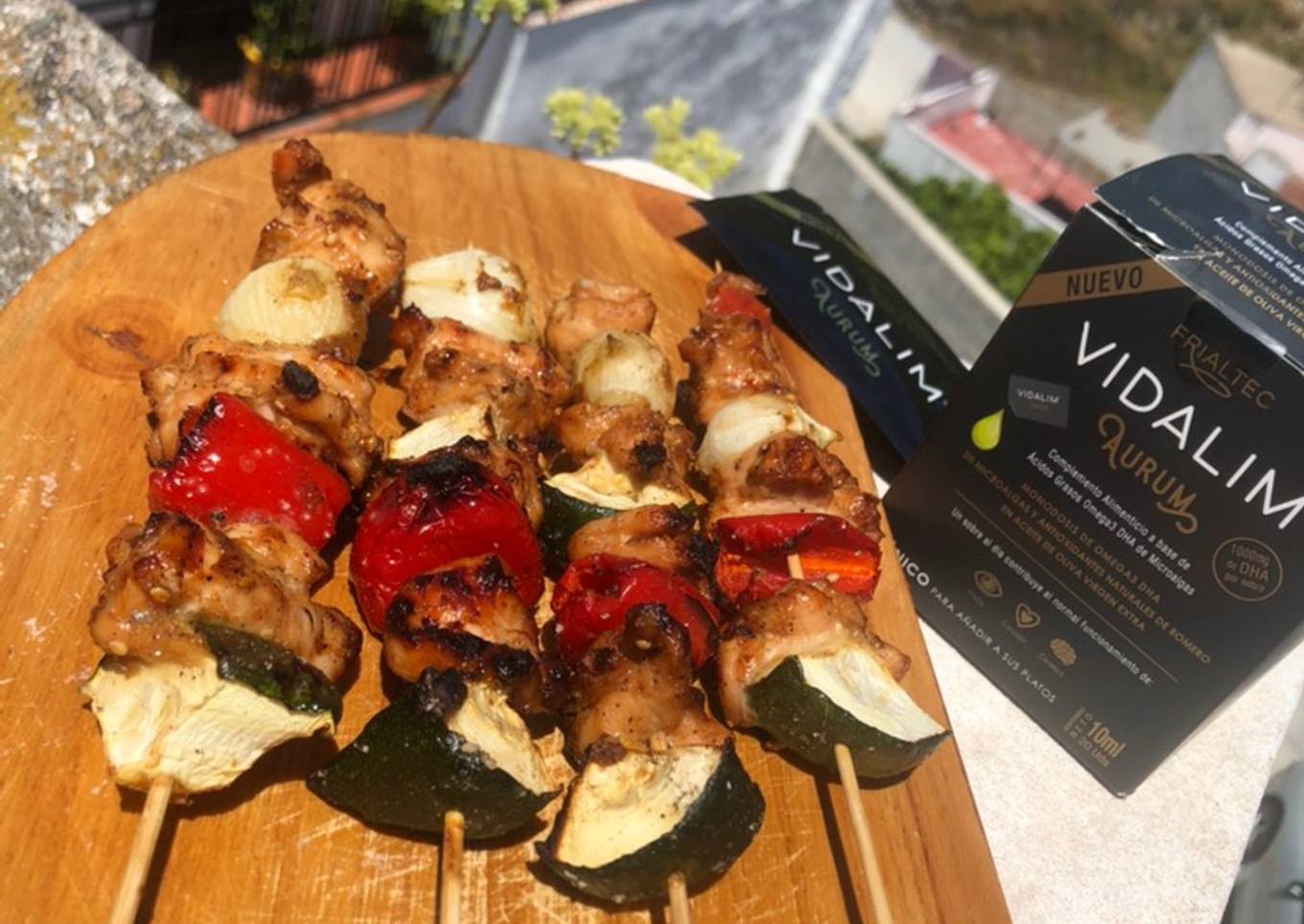 - Mientras tanto cortamos nuestras verduras de igual tamaño que el pollo, con unos pinchos de madera vamos enlazando pollo y verduras, sazonamos y las ponemos en la parrilla y cocinamos hasta que el pollo esté! ¡Y a disfrutar!! 🤤