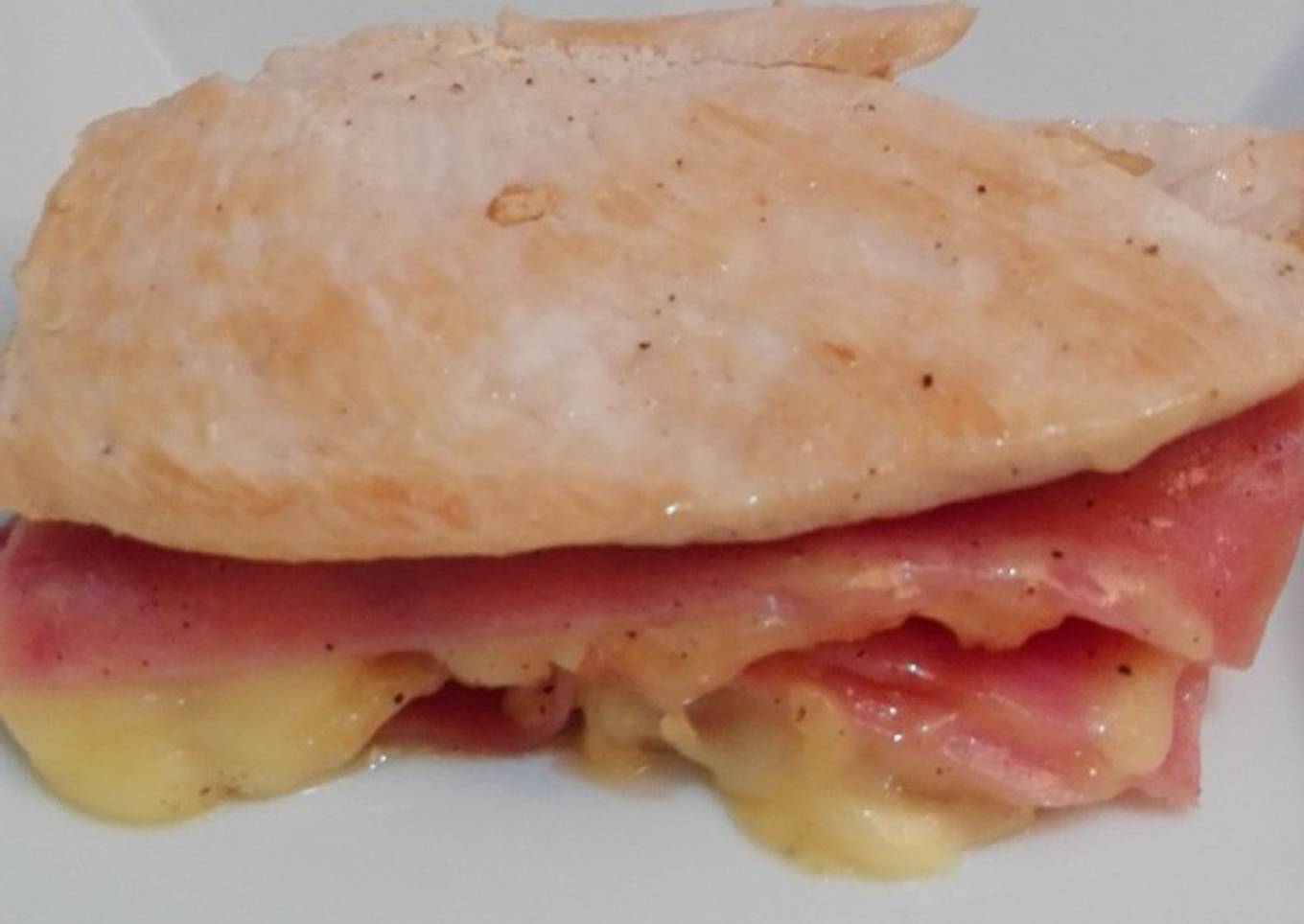 - Montar el pastel con una primera capa de filetes de pollo, cubrir con el jamón york y terminar con las lonchas de queso. Repetir este orden de pisos y terminar con filetes de pollo.