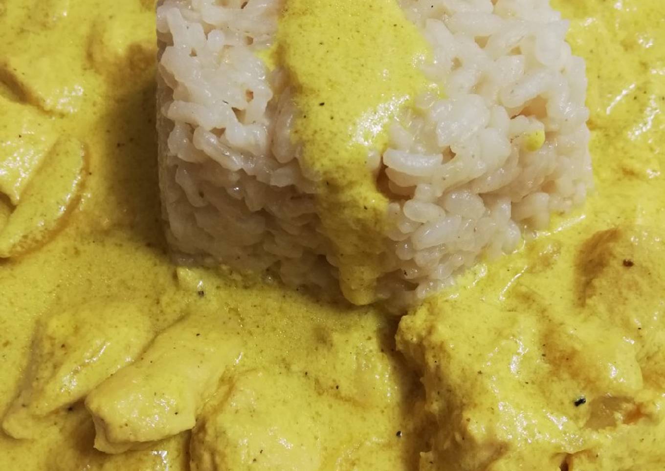 - Pasado los 40 minutos, vamos hacer el pollo. Poner a freír el pollo y la cayena en la sartén de la cebolla, cuando este dorado añadimos el curry, la cúrcuma y la canela, mezclar enseguida para que no amargue, añadir la cebolla y echar la nata y la leche, bajar el fuego.