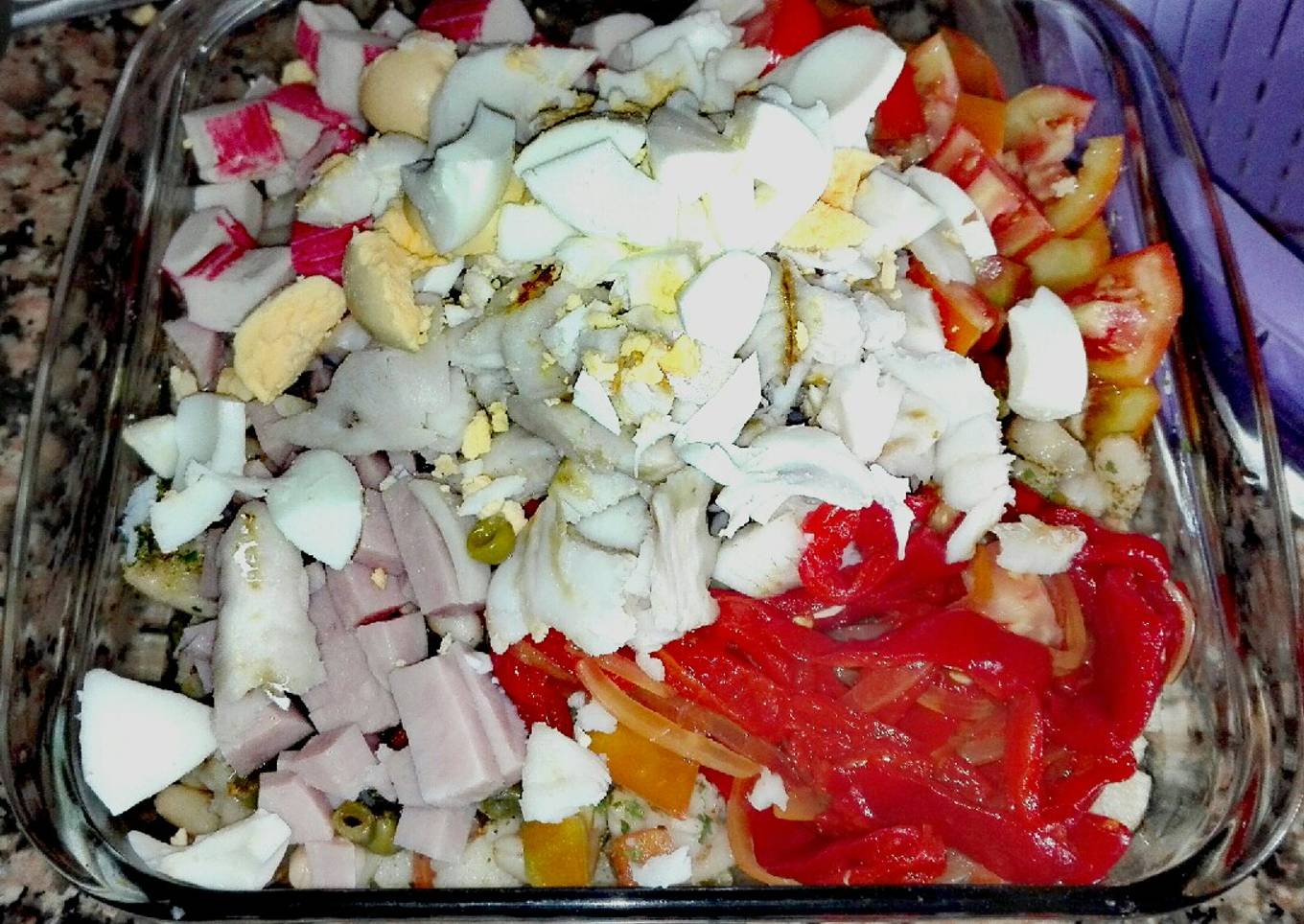 - Cuarto: añadimos la lata de pimientos del piquillo y cebolla, los dos huevos picados, las bocas de mar y la pechuga de pollo troceada, la merluza cocida y picada, el perejil y el tomate. Regamos con vinagre y aceite. Rectificamos de sal si hiciera falta. Removemos todo bien y servimos.