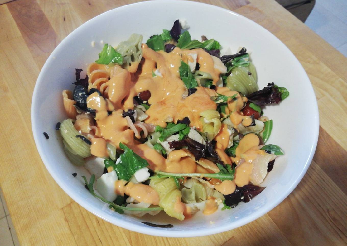 - Mezclamos los ingredientes y añadimos la salsa rosa por encima, mezclamos y listo para comer.