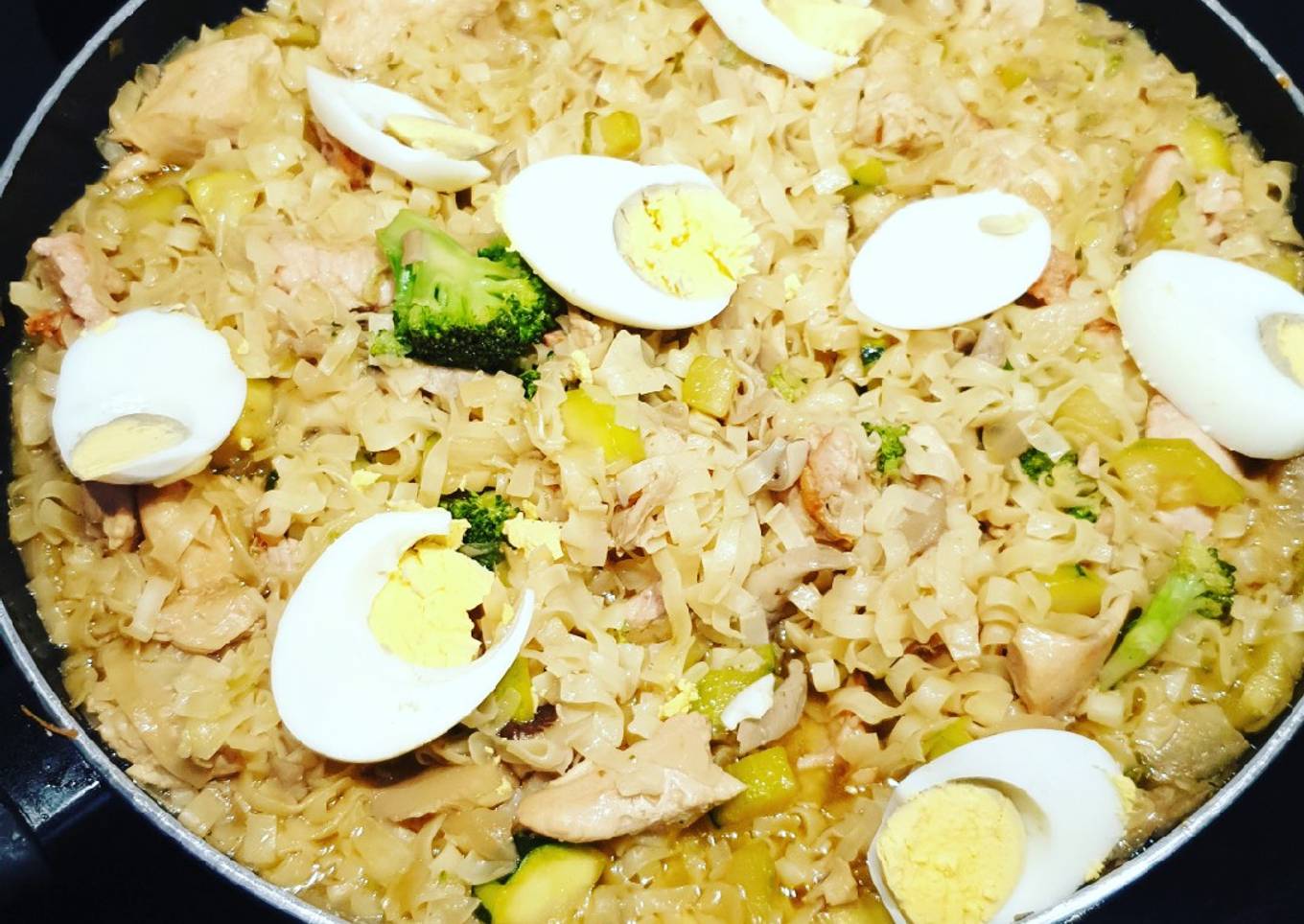 - Ahora ponemos los noodles rehogamos y añadimos el agua o caldo.pollo, dejamos que se haga por 3-4 minutos para que no se hagan demasiado y quede como una masa.