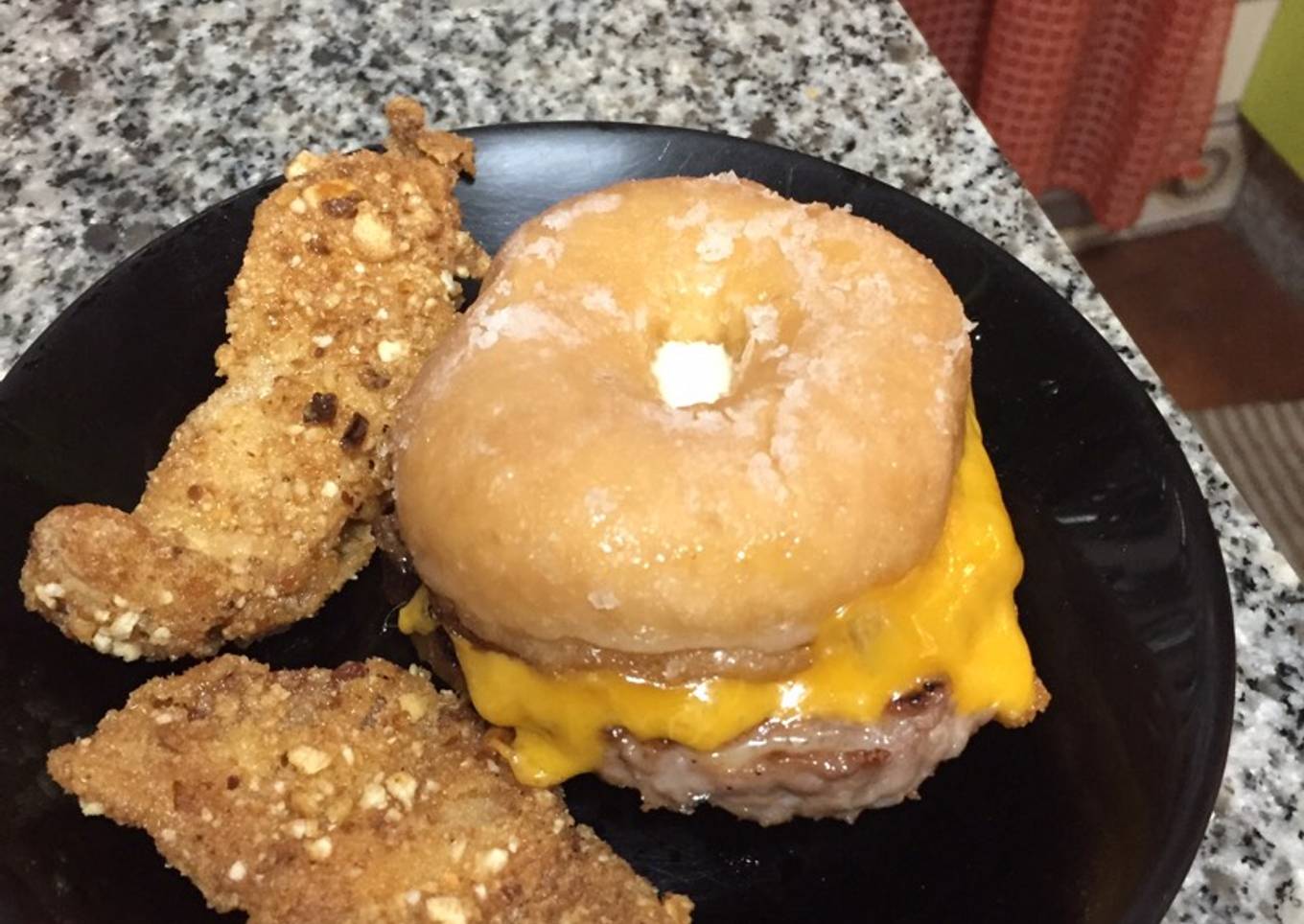 Hamburguesa de donut acompañada con pollo frito