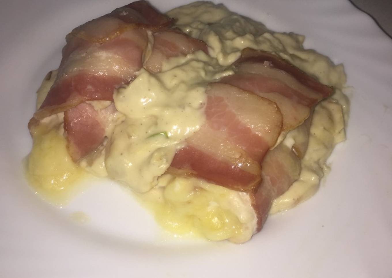 - En una bandeja apta para horno pondremos 2 lonchas de bacon, encima una pechuga de pollo y media loncha de queso. Enrollaremos y lo sujetaremos palillos de dientes. Así hasta hacer las cuatro pechugas.