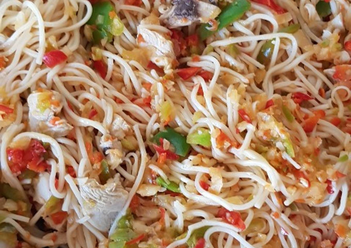 - Sofríe los pimientos y cebolla junto con el pollo hasta que se poche
