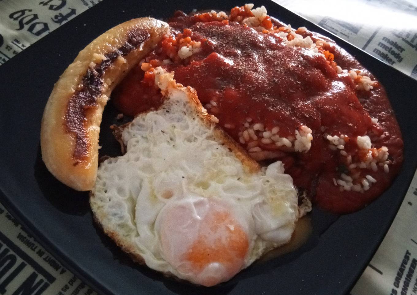 - Se emplata el arroz con la panceta y el tomate por un lado, el plátano por otro y los huevos por otro.