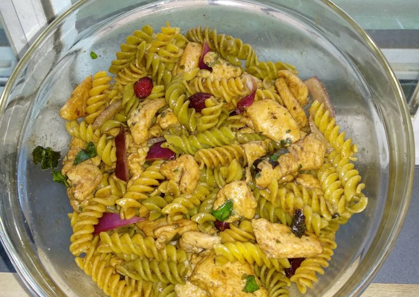 - Ahora en un bol o cuenco vamos echando la lechuga ya enjuagada, las hélices de colores ya cocidas y escurridas, el pollo, los arándanos, las nueces, los huevos muy bien picados y la cebolla también. Mezclamos todos muy bien y aliñamos al gusto de cada uno con un poco de sal, aceite de oliva y el vinagre de Módena.