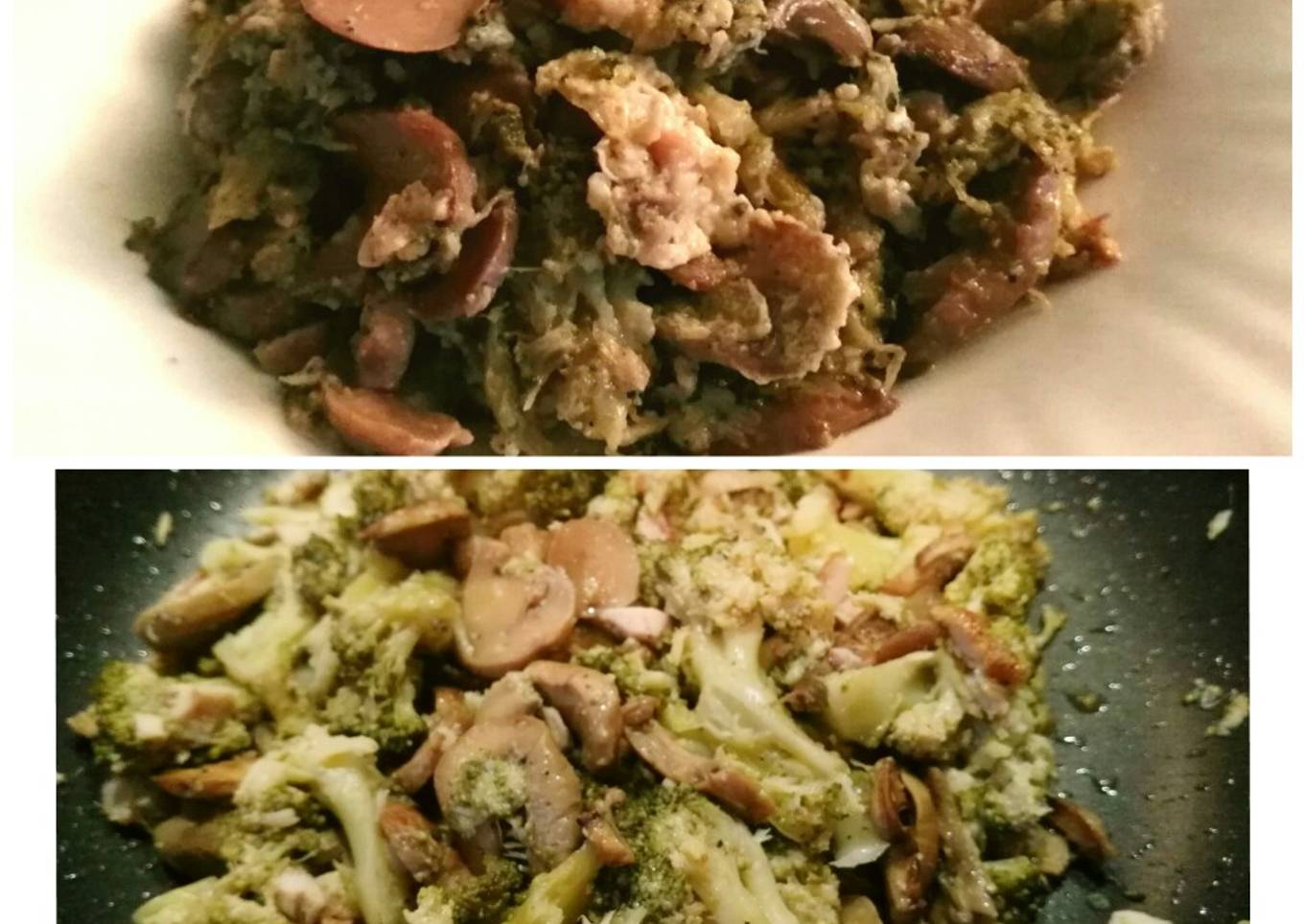- Cuando los champis estén doraditos, añadimos el brócoli y el pollo, dos cucharadas de vino blanco y ajo molido.