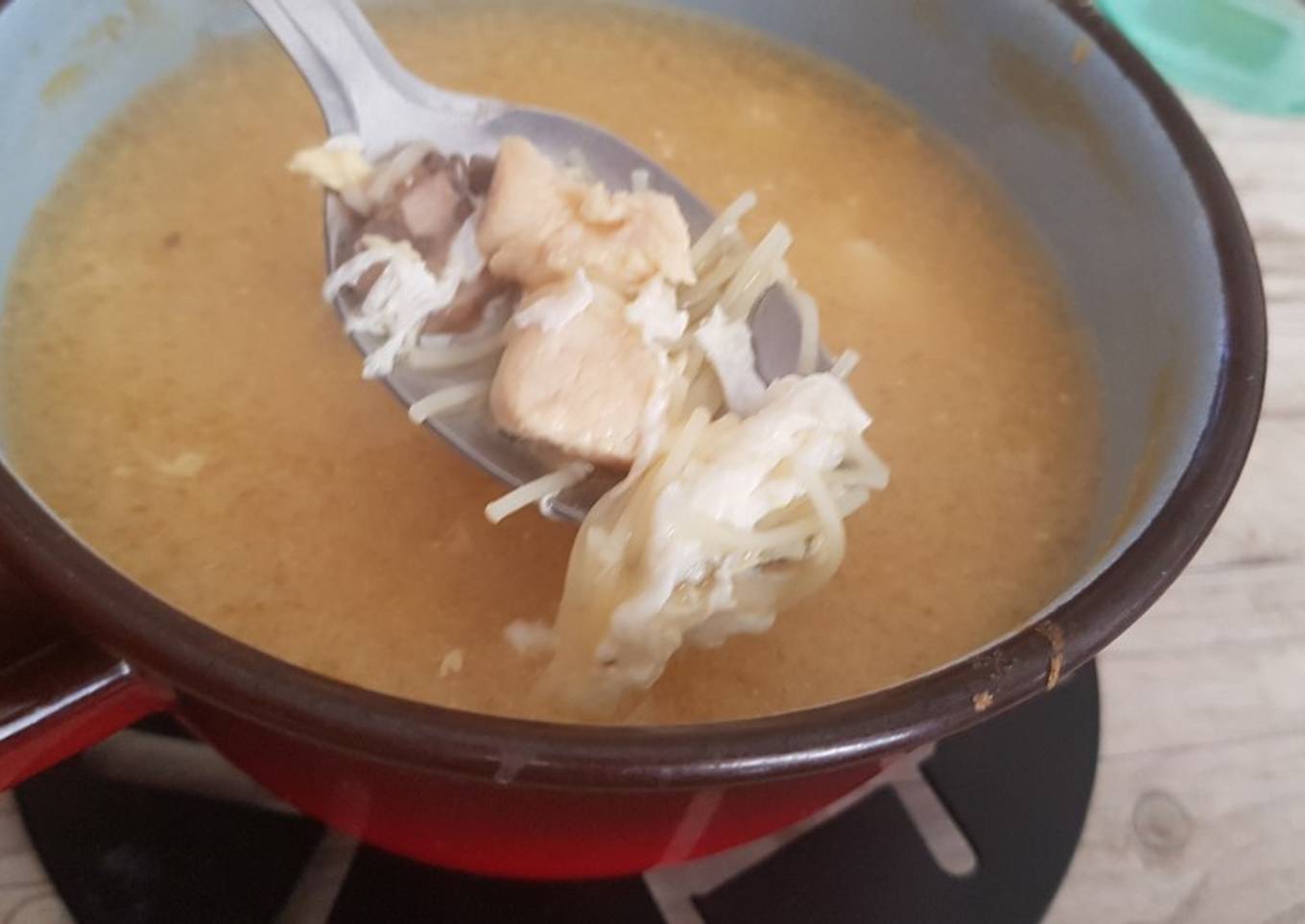 - A continuación añadimos una abundante cucharada sopera con preparado de pasta de miso blanco, removemos bien para que la pasta de miso se deshaga y se mezcle bien con el caldo de pollo